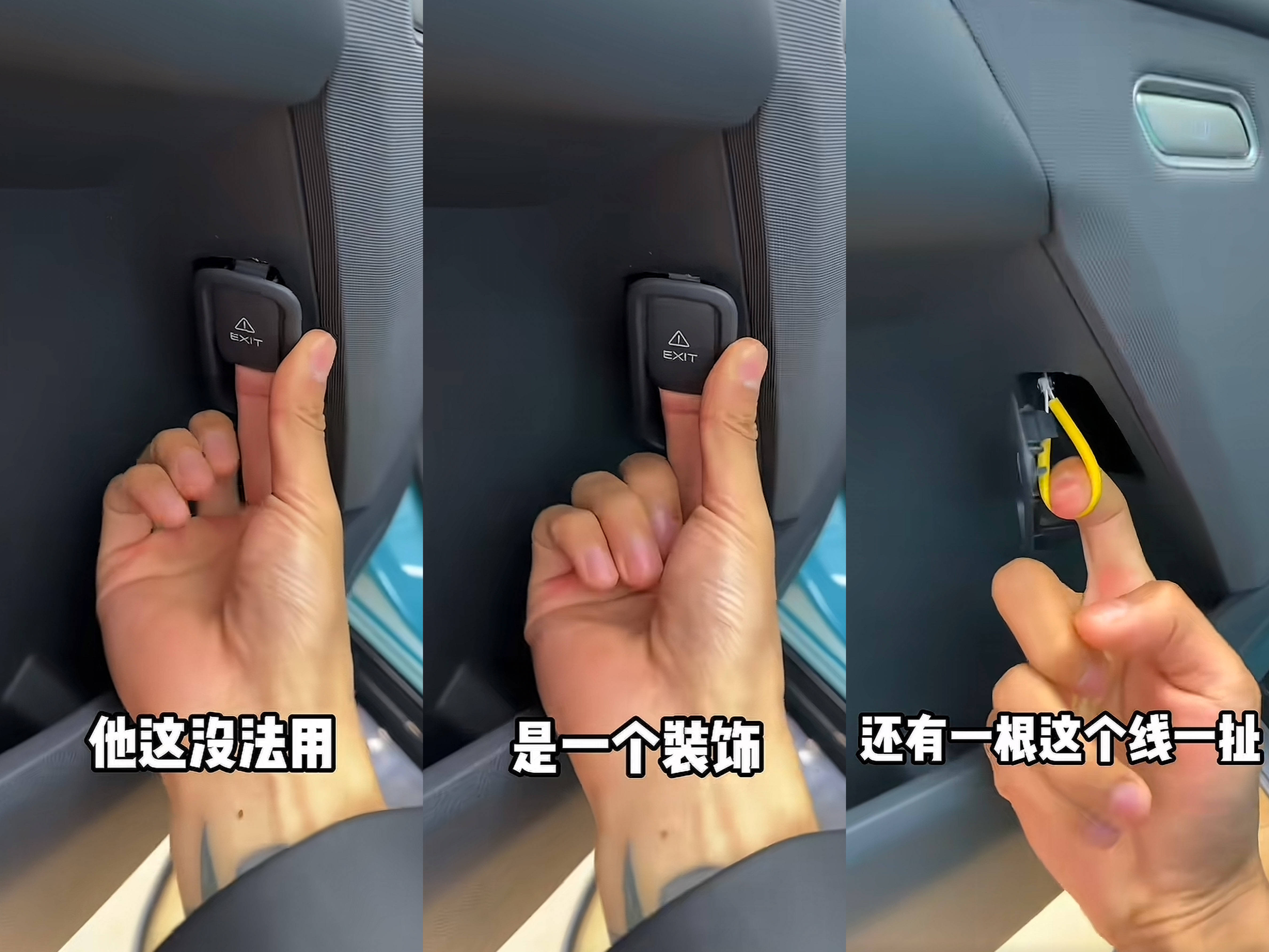 而据网友实测,eπ007的应急拉手位置是一个塑料件装饰,需要扣开后去拉内部的黄色拉环。